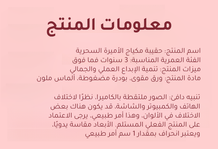 حقيبة مكياج مقلدة بالكامل تجعل وضع المكياج أشبه بلعبة. نمي مهارات الفتيات العملية وحسّهن الجمالي منذ الصغر. دعي الفتيات يطلقن العنان لخيالهن ويتألقن كعارضات الأزياء. قدّمي لابنتكِ هدية مميزة الآن! تتضمن 41 قطعة.